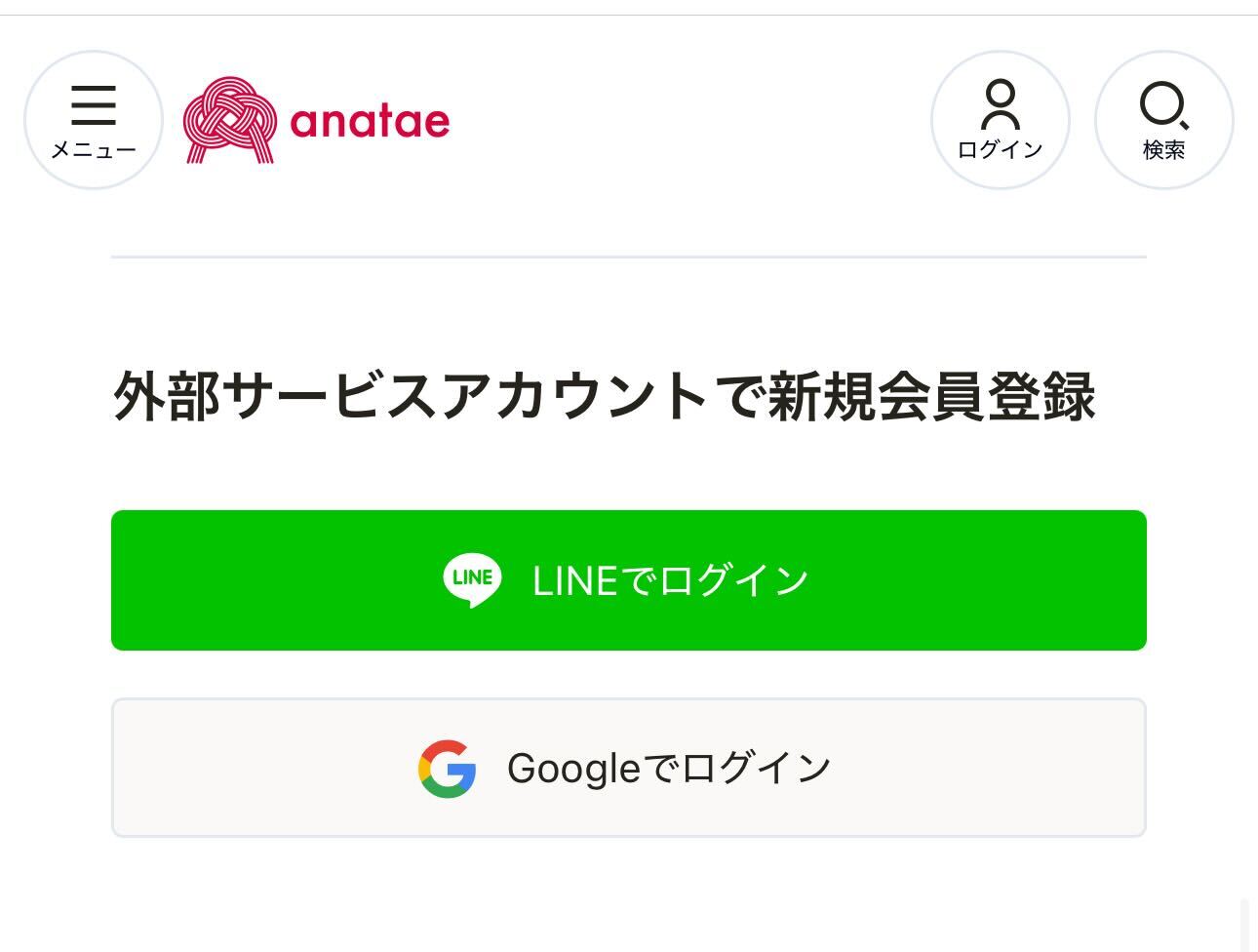 アカウントを持っている方はログイン、持っていない場合は新規アカウントの登録をします。メールアドレスの他に、GoogleアカウントまたはLINEのアカウントでanataeのアカウントを登録することができます。