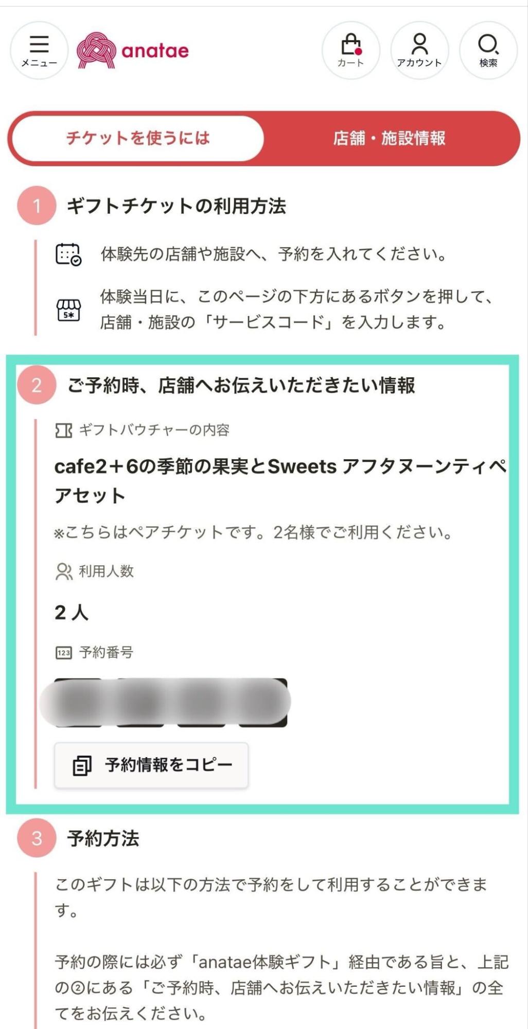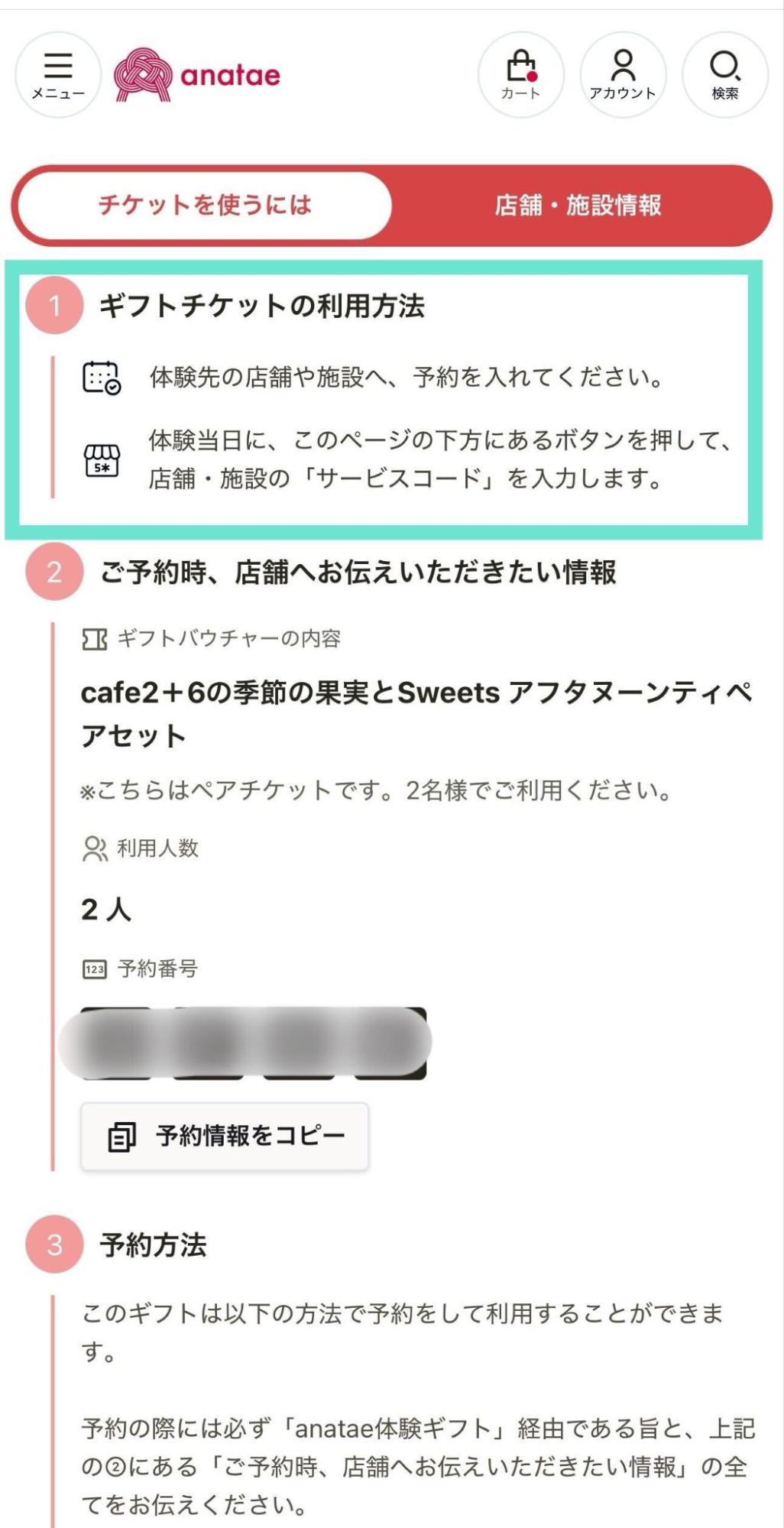 以下のように①ギフトチケットの利用方法に「予約を入れてください。」とある場合には、予約をする必要があります。