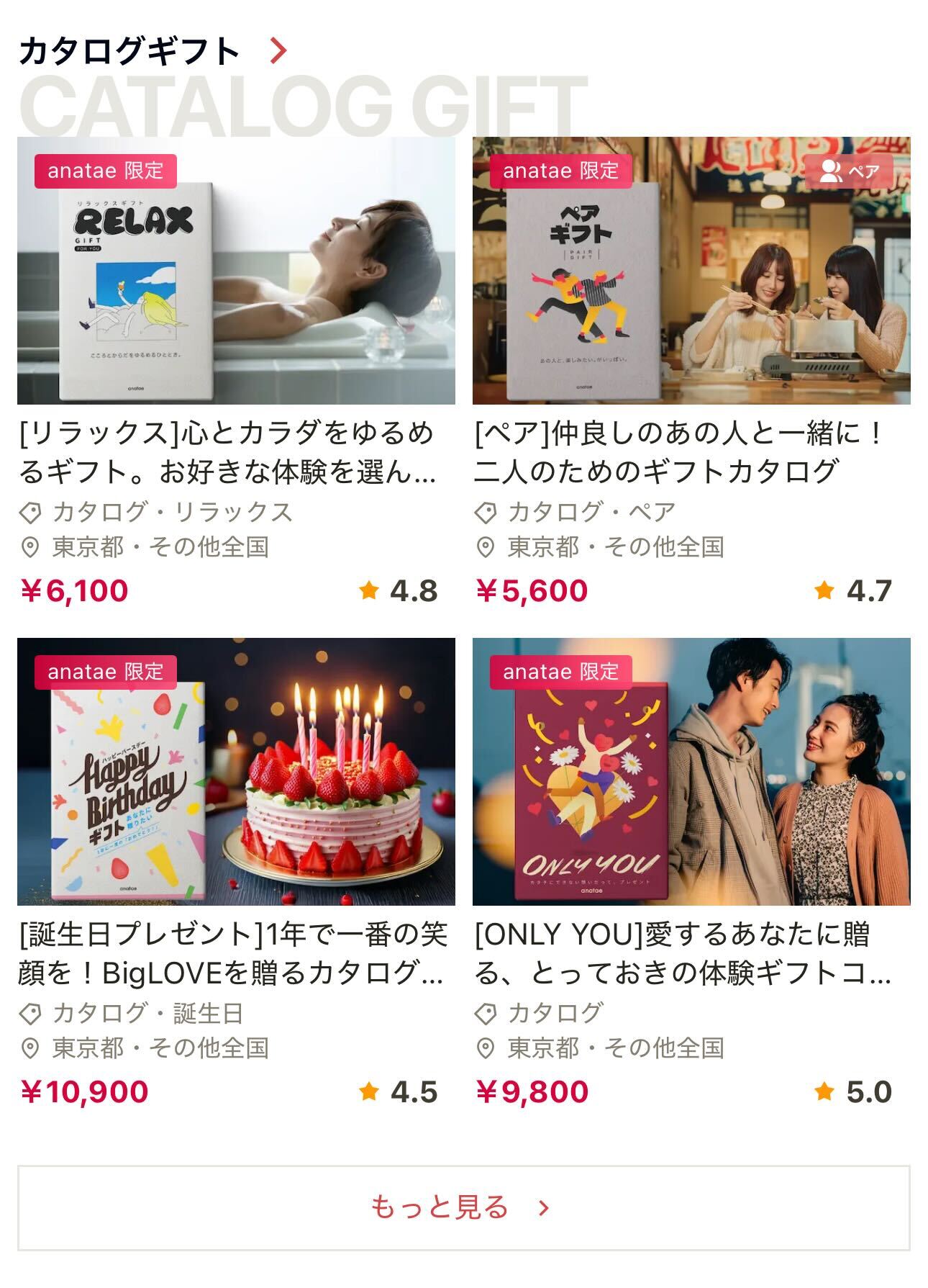 anatae の体験ギフトには、グルメ、旅行、スパ、レジャーなど多彩なカテゴリーの体験ギフトが揃っているので、カテゴリーから検索してもOK。価格やエリアでの絞り込みも可能です。