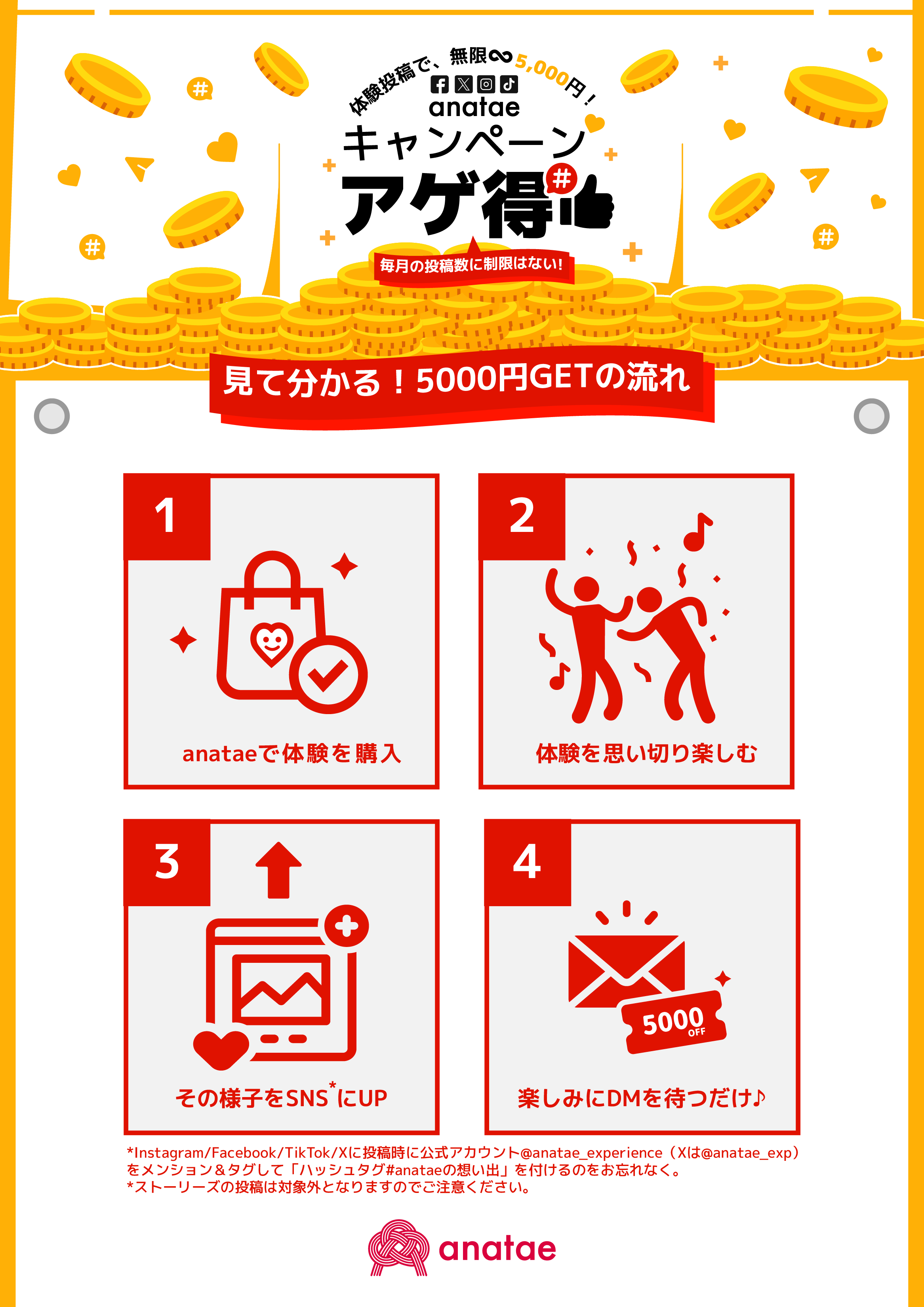 anataeで購入した体験の様子をSNSにアゲるだけで、無限に5,000円クーポンがゲットできます!