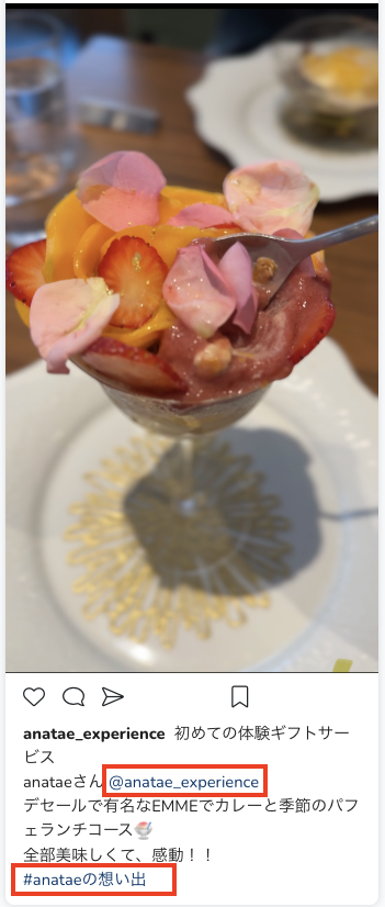 - anataeで購入した体験の様子をSNS(Instagram/Facebook/TikTok/X)でハッシュタグ「#anataeの想い出」を付けて投稿するだけ! 楽しそうな体験の様子がわかれば、コメントは一言でもOKです。