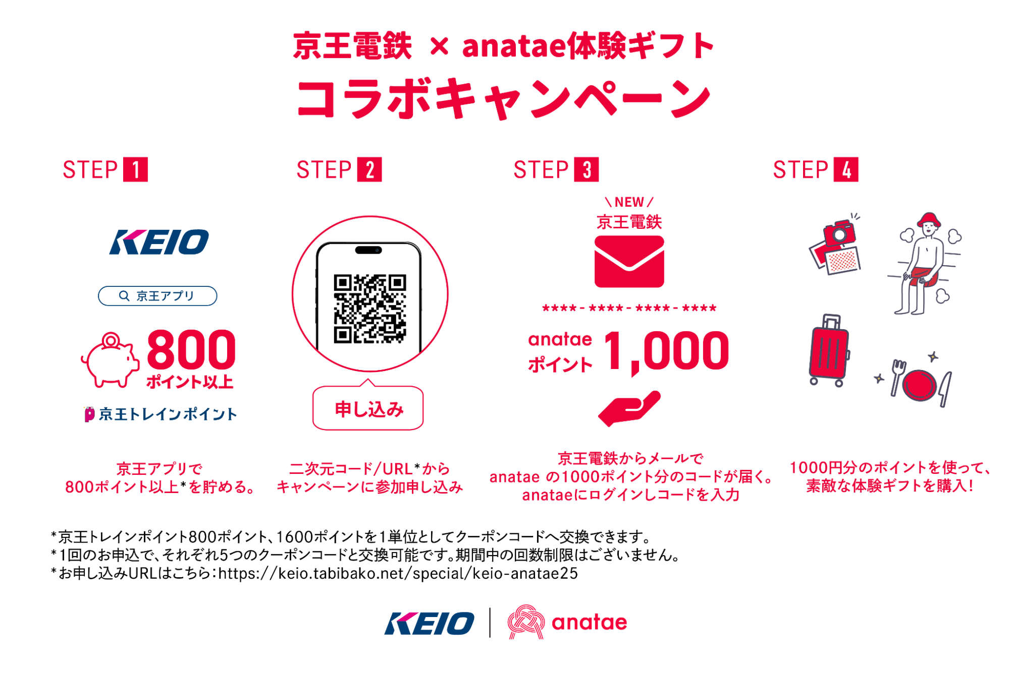 このたび開始するポイント交換キャンペーンは、「京王トレインポイント」を、体験ギフト・マーケットプレイス「anatae」の約1,000種類以上の体験ギフト購入に利用できるanatae ポイントと、交換ができる取り組みとなります。