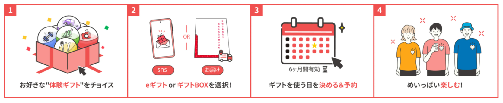 そして4つ目は有効期限の長さです。体験ギフトのチケットは6ヶ月間有効で、受け取った人が自分の都合に合わせて体験日を選べます。このような柔軟さも、贈った相手に喜んでもらえる大きな理由のひとつです。