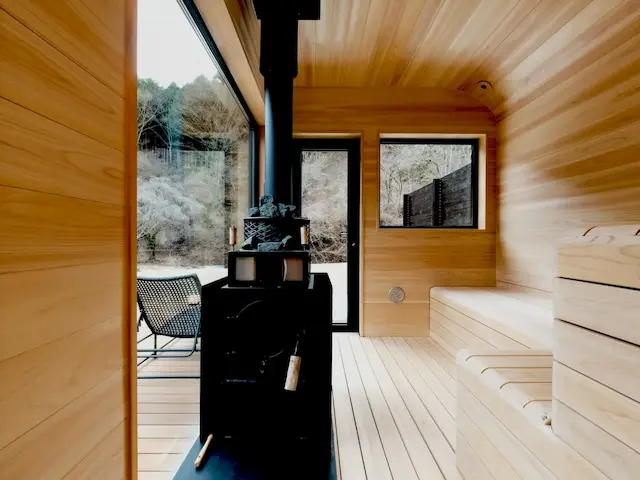 薪ストーブ式のサウナは温度や湿度の調整もできるため、心地よい空間を整えられます。ロウリュのたびに立ちのぼる香りと蒸気は、心と体を優しくほぐしてくれるでしょう。庭先には渓流が流れており、まるで海外リゾートのような自然の水風呂も楽しめます。