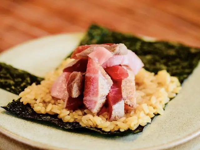 体験内容は、赤身の漬けや中トロ、大トロ炙りのマグロ手巻きを含む15貫のおまかせ握りと、小皿料理3品のコースです。さらに、ワインペアリングとプレミアム日本酒を含む飲み放題もセットになっており、和洋の名酒を一度に楽しめる特別感あふれる内容となっています。提供直前にスモークを施す鯖や、ミシュラン一つ星「天婦羅みやしろ」監修の海老天海苔巻きなど、目にも楽しい演出が魅力です。